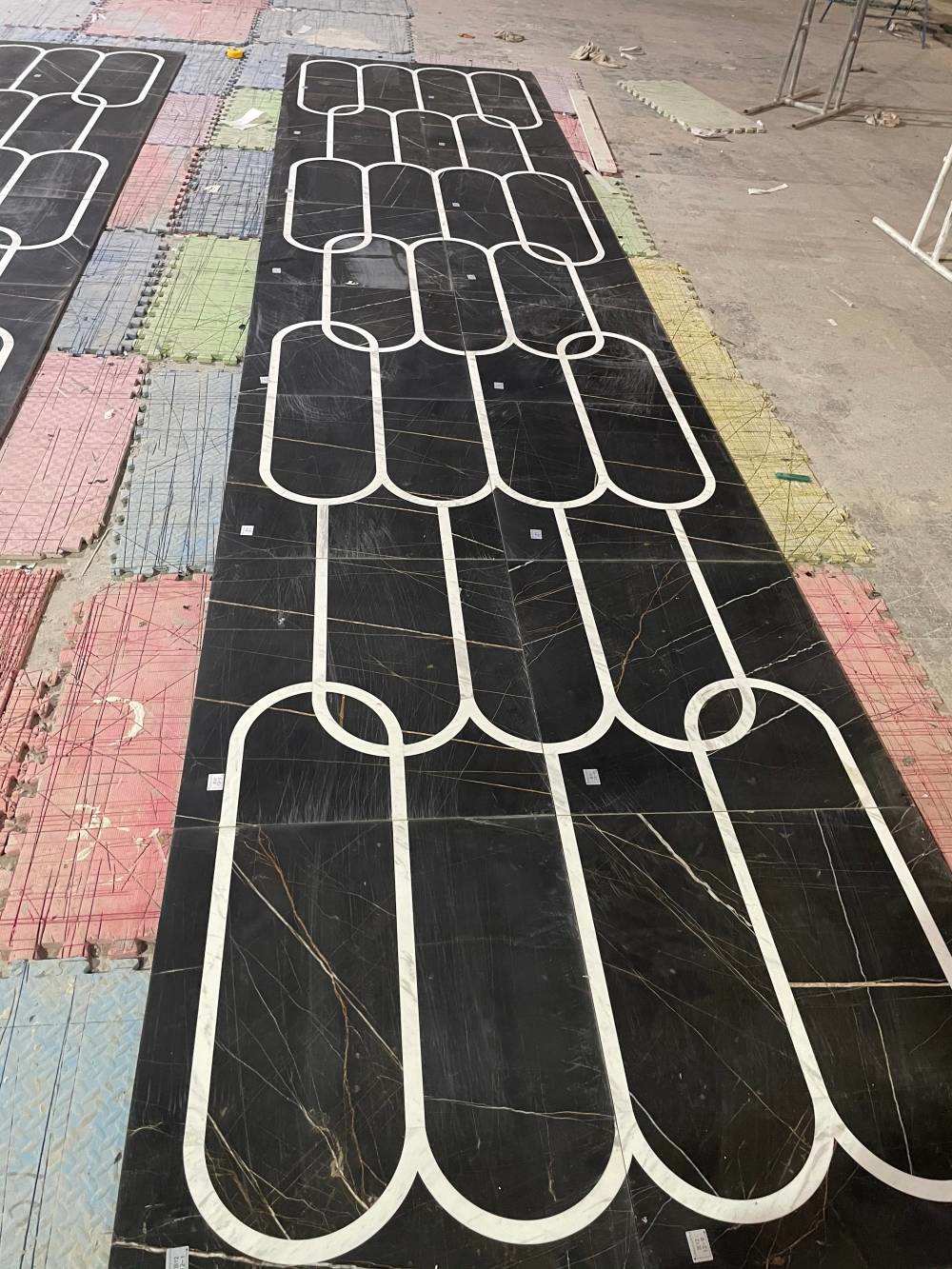 This project presents a custom marble inlay flooring design developed for a hotel corridor using Black Marquina marble and Carrara White marble.